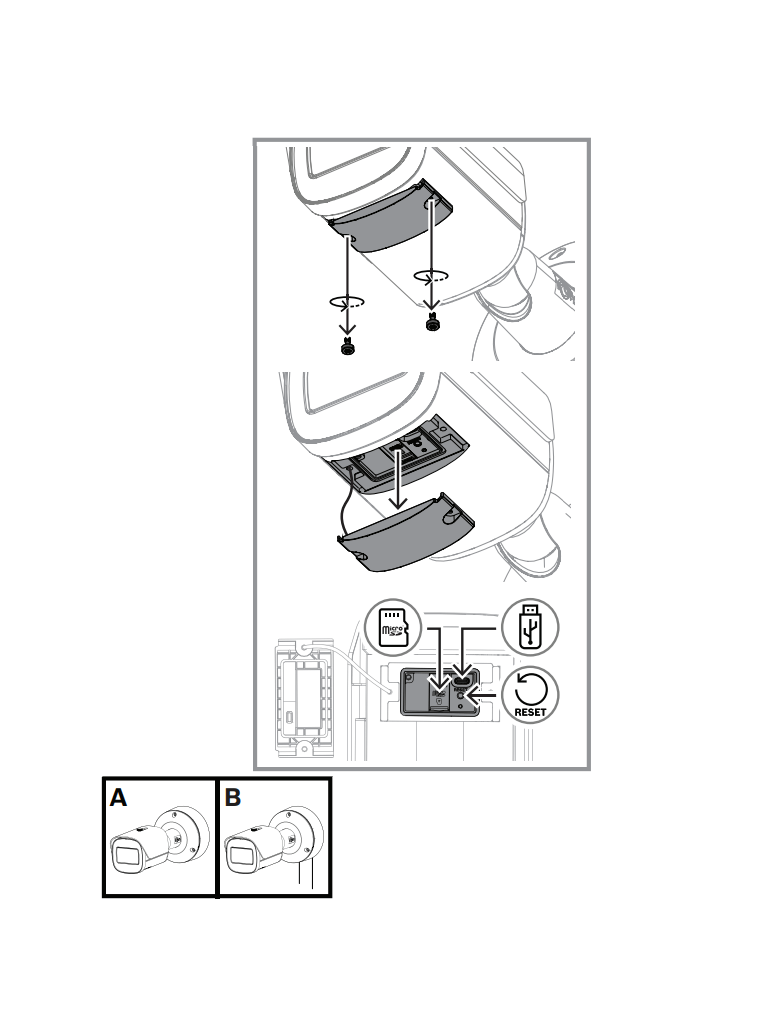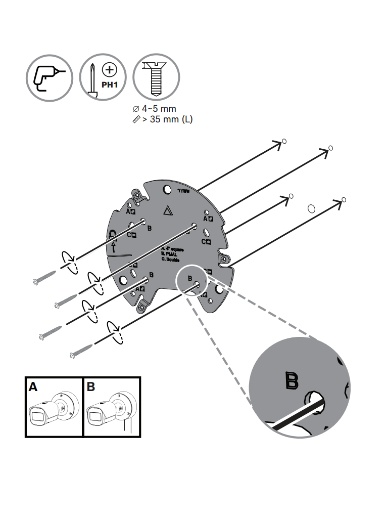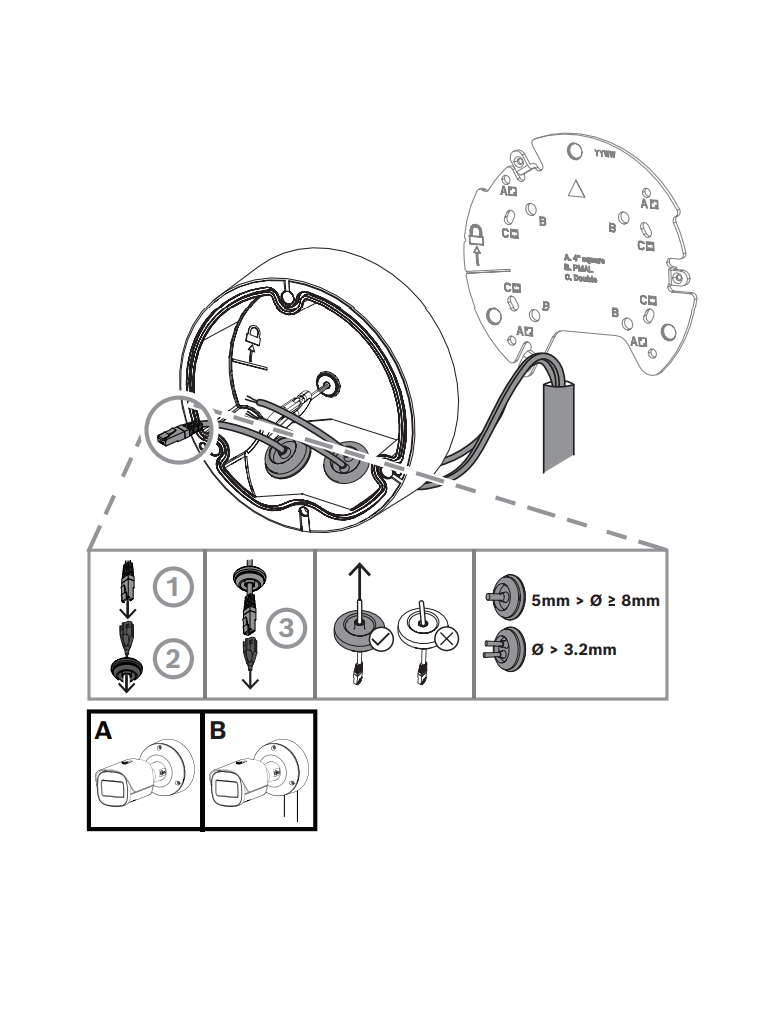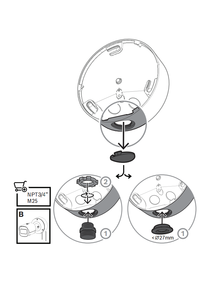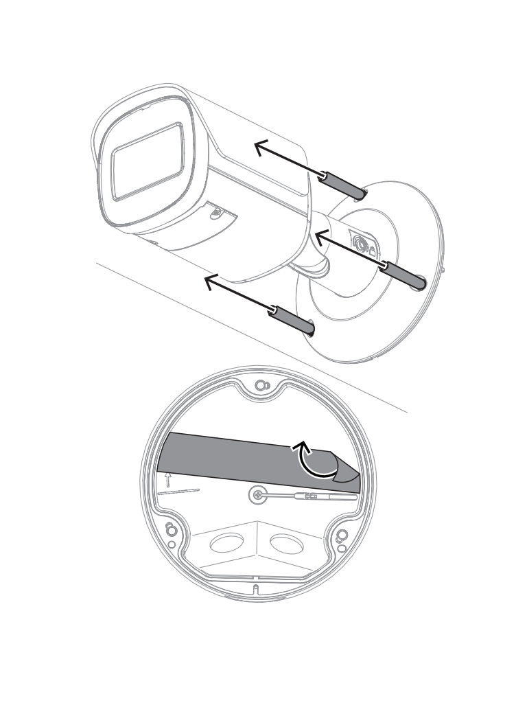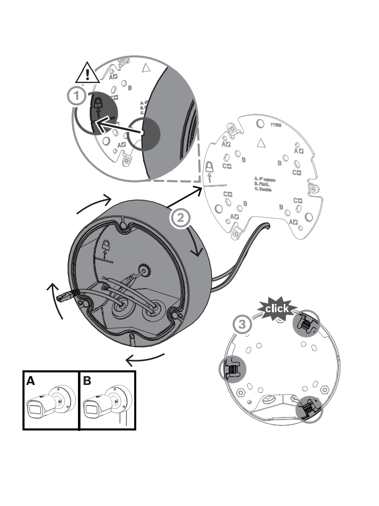 La cámara NBE-5703-AL utiliza el concepto de eficacia probada de instalación en tres pasos. La placa de montaje dispone de varios patrones de agujeros para la instalación en cajas eléctricas (cuadradas de 4 pulg. y dos entradas) y en los accesorios universales de Bosch. La caja trasera se puede acoplar con un sencillo giro y clic. Todos los cables se pueden conectar en la caja trasera.
