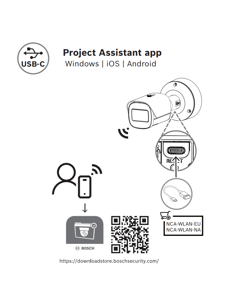 Puesto que la cámara está equipada con un puerto USB-C para mochila USB inalámbrica (se vende por separado: NCA-WLAN-EU, NCA-WLAN-NA), el instalador puede realizar fácilmente la configuración inicial vía inalámbrica. Si utiliza un dispositivo móvil con la aplicación Bosch Project Assistant, es posible realizar una configuración inicial y enfocar y ajustar el zoom de la lente para ajustar la escena adecuada. Basta con conectar la mochila USB inalámbrica y dirigirse a la aplicación Bosch Project Assistant, disponible para iOS, Windows o Android.
