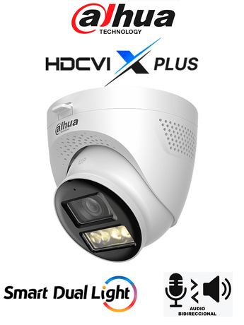 La cámara DAHUA DH-HAC-HDW1500TQ-IL-T está diseñada para vigilancia exigente, capturando video en 5 MP con una lente fija de 3.6 mm que ofrece un campo de visión de aproximadamente 88°. Su sistema de iluminación dual inteligente alterna entre luz infrarroja y blanca para mantener imágenes a color incluso de noche, con un alcance estimado de 20 m. Integra micrófono y permite audio bidireccional, mientras que su WDR real de 120 dB mejora la visualización en escenas con contraste. Construida con materiales metálicos, cuenta con grado IP67, lo que la hace apta para exteriores.