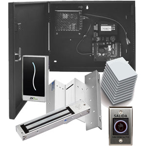Control de Acceso Profesional para 1 Puerta con Lector de Tarjeta MIFARE / Botón de Salida sin Contacto / Contrachapa Magnética y Soporte para Contrachapa / Paquete de 50 Tarjetas / Administra con Software ZK Access 3.5.