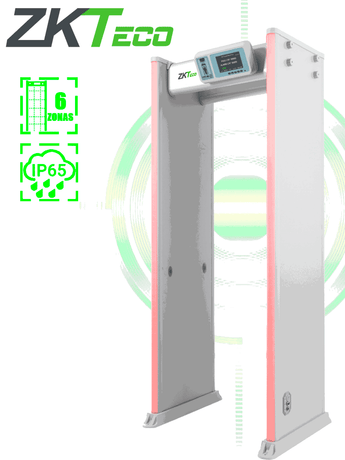 ZKTECO D4330IP65 Arco Detector de Metales con protección IP65 para semi exteriores, con 33 zonas de detección, 300 niveles de sensibilidad, pantalla HD 7", indicadores LED en ambas vistas, control remoto y batería de respaldo incluida.