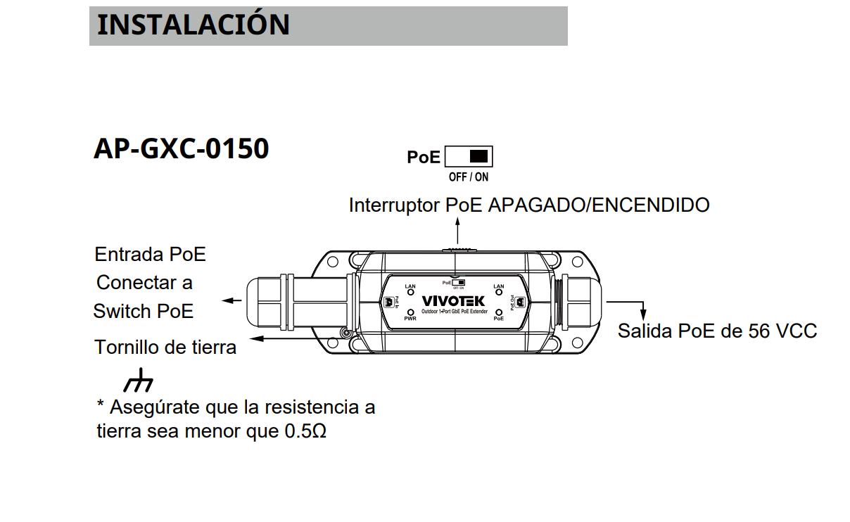VIVOTEK AP-GXC-0150 - Extensor PoE para exterior con 1 puerto Gigabit GE, conexión en cascada hasta 300m, salida PoE de hasta 68W, y protección IP67 e IK10.