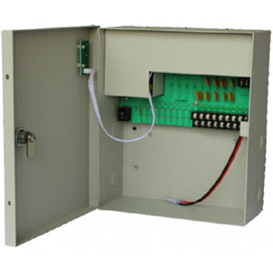 Fuente de poder 12V CD / 10 Amperes / Distribuidor para 9 camaras / Espacio para bateria de respaldo / Certificacion UL.