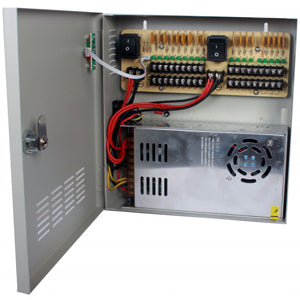 Fuente de poder 12V CD / 30 Amperes / Distribuidor para 18 camaras / 1.65 Amperes por canal / Ce / FCC / Certificacion UL.
