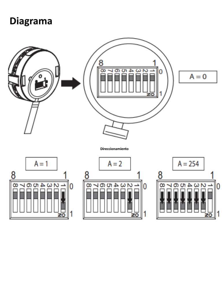 - Ajuste de direcciones: 8 interruptores DIP