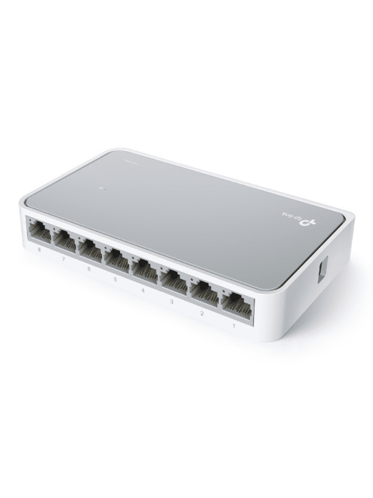 TP-LINK TL-SF1008D - Switch de escritorio con 8 puertos RJ45 Fast Ethernet, diseño de plástico y configuración plug and play.