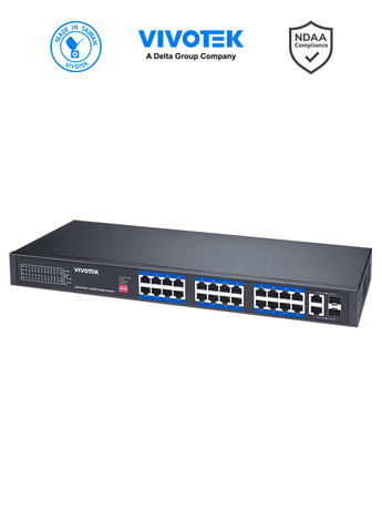 VIVOTEK AW-FGT-260P-370 - Switch PoE no administrable, 24 puertos PoE FE RJ45, 2 puertos Combo GE RJ45/SFP, 30W por puerto, 370W totales, PoE Extendido Adaptable hasta 250mts, 8.8 Gbps, Protección 6KV
