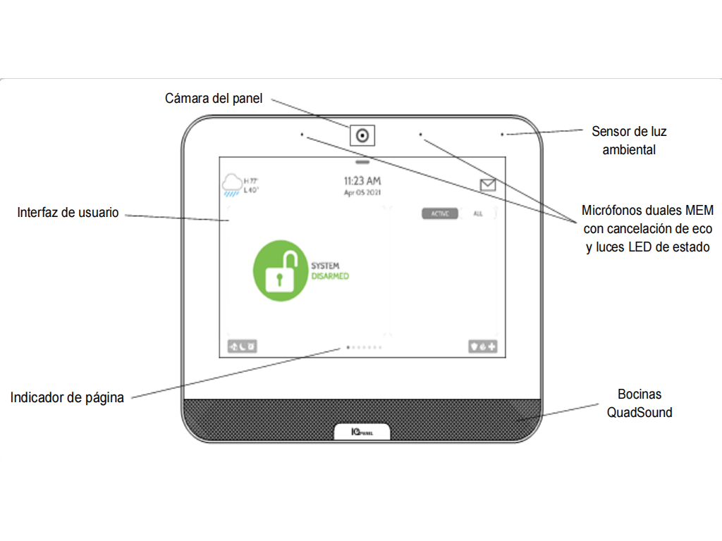 El IQ Panel 4 es una solución de seguridad All-In-One diseñada con una estética elegante y tecnología de vanguardia. Su centro de control es una pantalla táctil HD de 7 pulgadas con acabado en vidrio capacitivo que ofrece una interfaz intuitiva para el usuario. Este panel destaca por su capacidad de hibridación, ya que gracias a la tecnología Dual SRF con PowerG, permite utilizar sensores modernos de largo alcance cifrado y, al mismo tiempo, mantener la compatibilidad con sistemas inalámbricos heredados. Su sistema de instalación SmartMount ofrece total versatilidad, permitiendo un montaje limpio tanto en pared como en soporte de mesa.