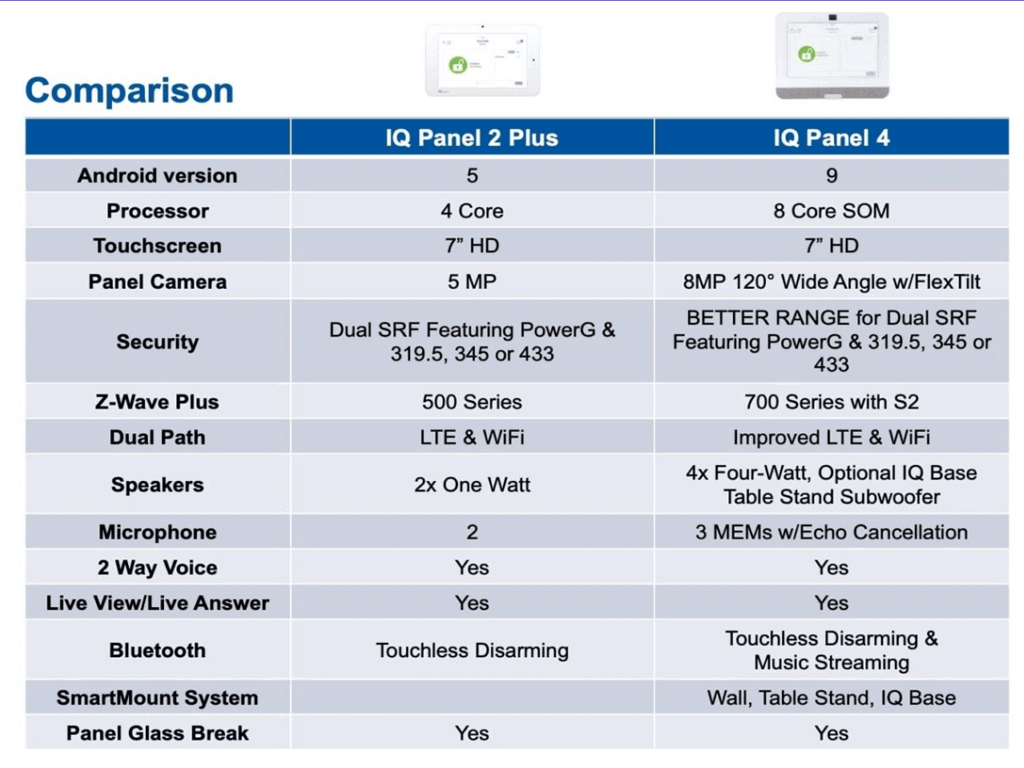 El IQ Panel 4 incluye un comunicador AT&t LTE y una tarjeta WIFI de doble banda. Por seguridad, se admiten los sensores PowerG de 915 MHz y 345 Mhz de Honeywell. Tiene una elegante pantalla táctil HD All-In-One de vidrio capacitivo de 7" y admite 128 zonas y 242 usuarios.