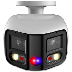 Cámara IP Bullet WizSense 2x4MP con visión de 180°, MultiVision, LED IR 25m y luz cálida 20m. Disuasión activa con micrófono dual y altavoz integrado, EPTZ, SMD 4.0, PoE, IP67, y ranura MicroSD. Ideal para seguridad avanzada.