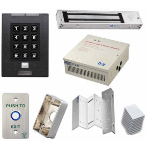 Paquete de teclado para control de acceso / Chapa magnetica de 280 Kg / Soporte ZL / Gabinete con fuente de 12 VDC 3A MP / Boton LED y tarjetas ID 125KZ.
