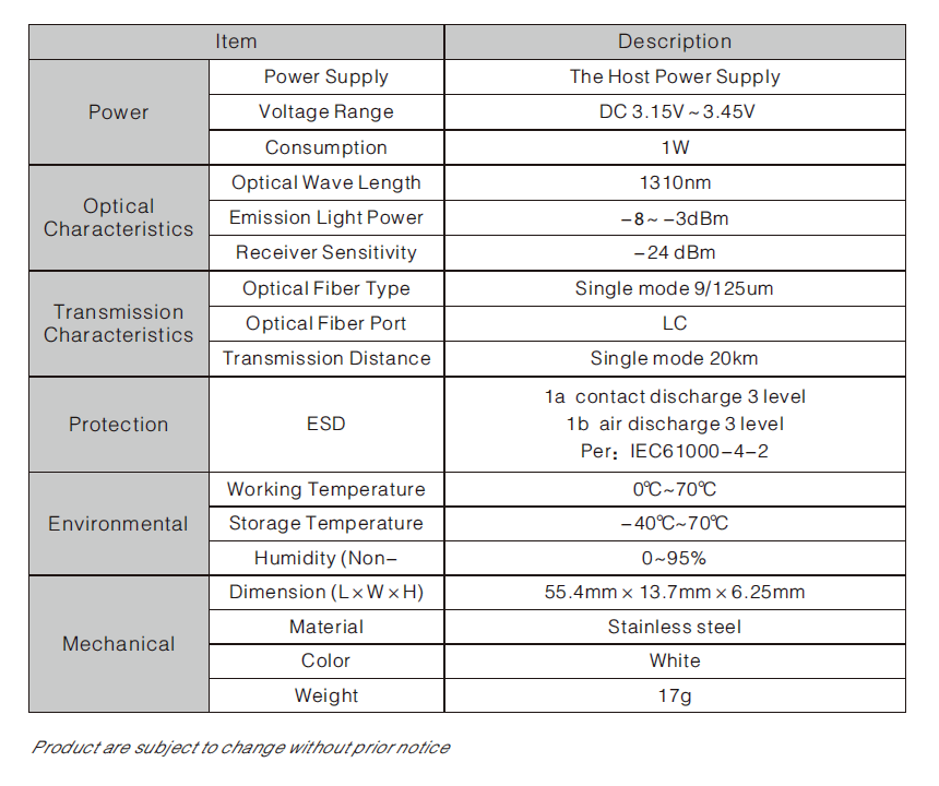 • Corriente de emisión de luz: -8~-3dBm.