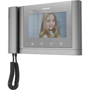 Monitor con auricular de color plata de 7 pulgadas soporta hasta 2 frentes de calle, cuenta con función de apertura de puerta.