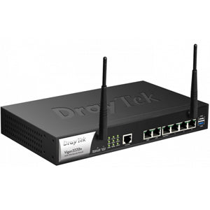 El Vigor 3220N está equipado con 4 puertos WAN Gigabit Ethernet, 1 puerto LAN Ethernet gigabit, un puerto DMZ, dos puertos USB, un puerto de consola y WLAN IEEE802.11n.