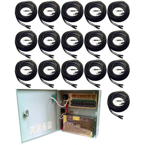16 Pak Cable de video y energia de 20 Mts / BNC Macho / 1 Conector macho y 1 conector hembra de energia / Para camaras HD hasta 6W + Fuente de poder 12V CD / 20 Amperes / Distribuidor para 18 camaras / Certificacion UL.