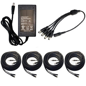 4 Pak Cable de video y energia de 20 Mts / BNC Macho / 1 Conector macho y 1 conector hembra de energia / Para camaras HD hasta 6W + Fuente de poder regulada + gratis divisor de energía de 5 conectores macho / 12V DC / 4.1 A MP / Color negro.