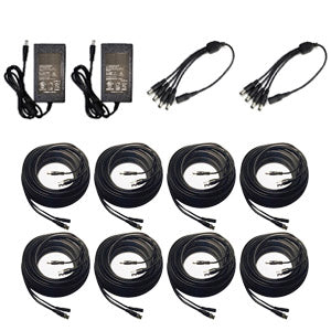 8 Pak Cable de video y energia de 20 Mts / BNC Macho / 1 Conector macho y 1 conector hembra de energia / Para camaras HD hasta 6W + 2 Pak Fuente de poder regulada + gratis divisor de energía de 5 conectores macho / 12V DC / 4.1 A MP / Color negro.