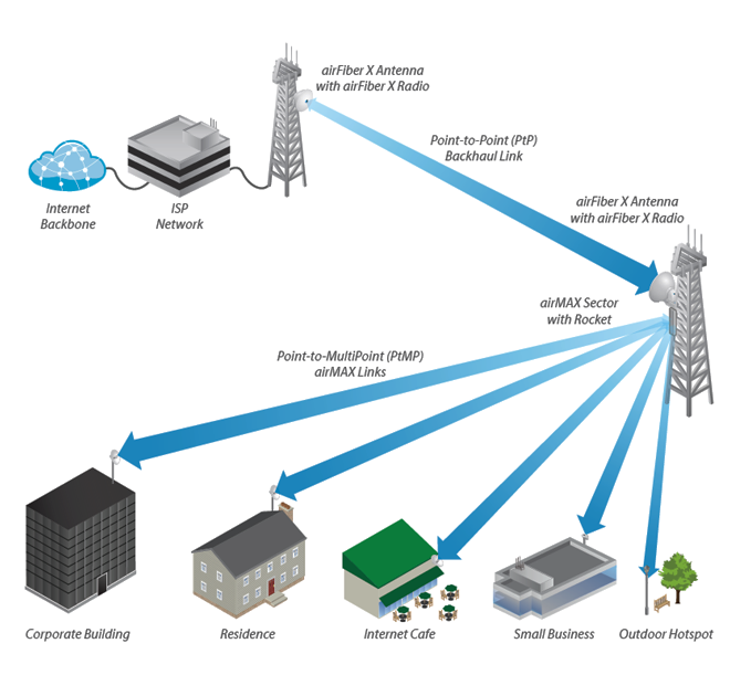 Las antenas airFiber X cuentan con avances significativos para el aislamiento del ruido y rendimiento de la señal, esto para poder complementar los radios de transmisión, para así poder realizar su estructura Backhauls y para conexiones en punto a punto (PtP). La forma compacta permite ser utilizadas en diversas aplicaciones, como enlaces para backhauls entre torres para así poder realizar sus enlaces punto a punto.