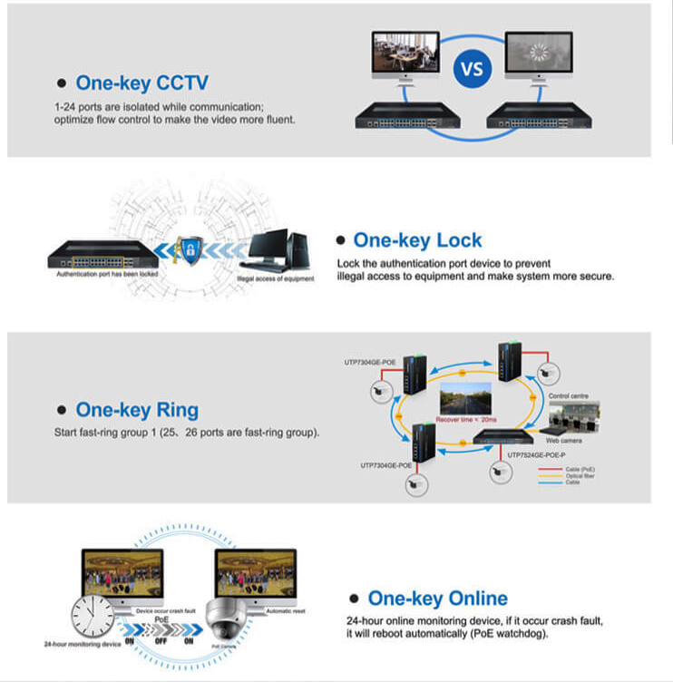 El switch UTP7524GEPOE4GF cuenta con 24 puertos PoE full Gigabit Ethernet administrable y también cuenta con 4 puertos SFP Gigabit Base-X para la subida de información, adicional a esto cuenta con un procesador industrial Broadcom por tal motivo soportan grandes transferencias de información. La administración de equipo esta basada en capa-2 así como administración de suministro PoE.