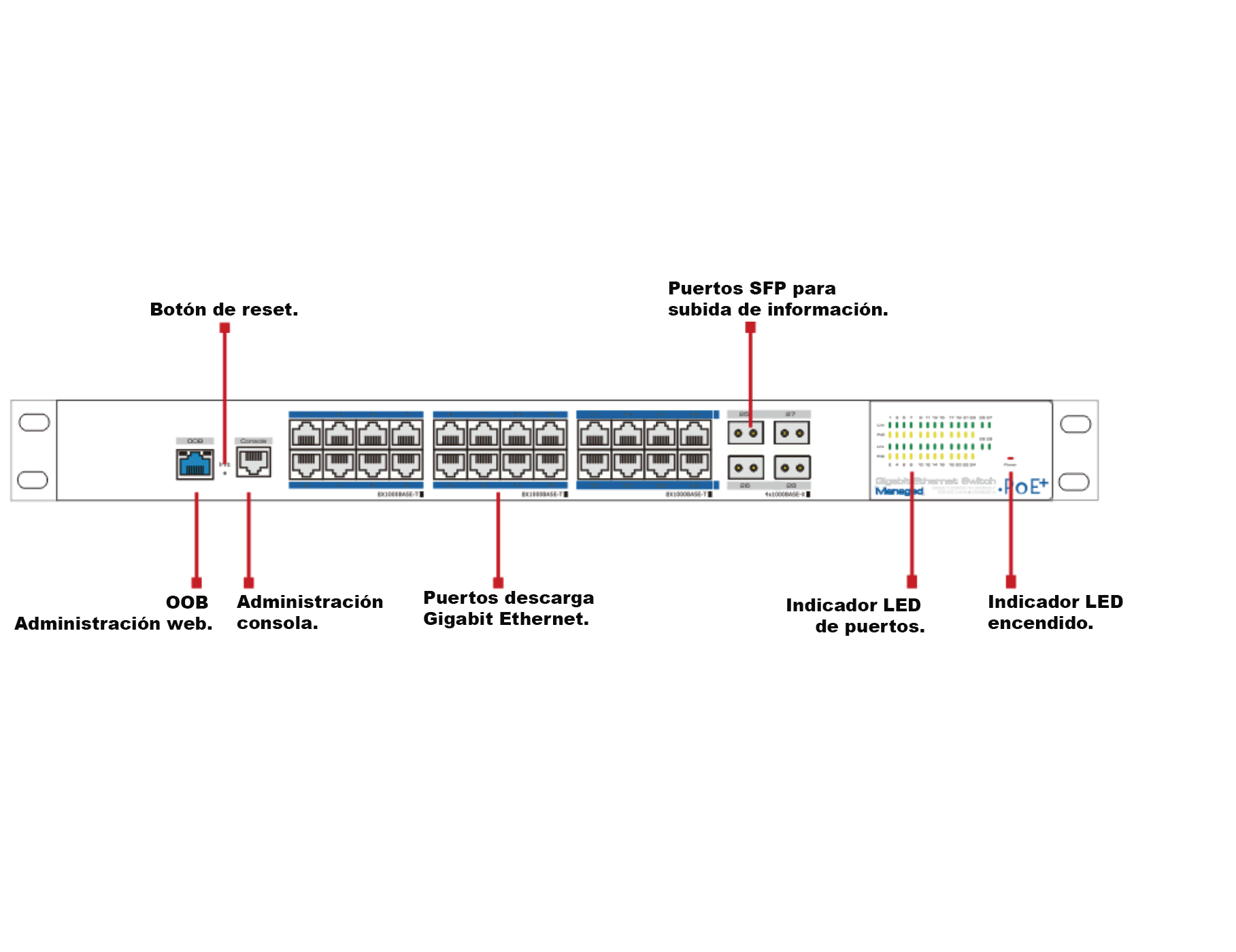 Puertos de descarga: 24 puertos PoE RJ-45 GE 10/100/1000Mbps.