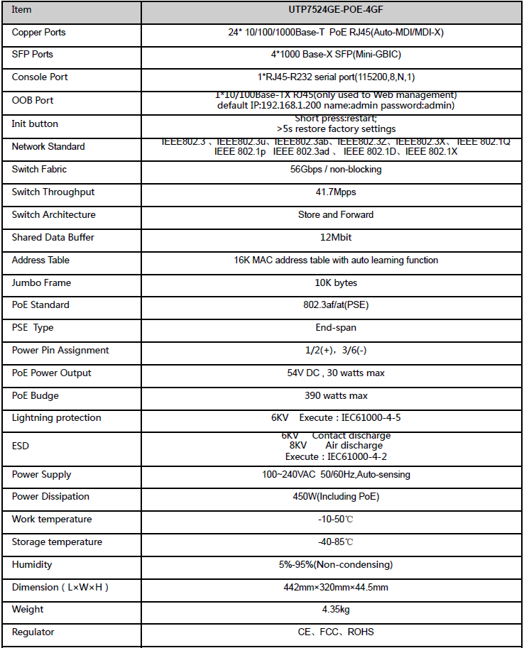 •OOB Port: 1*10/100Base- TX RJ45(only used to Web management) default IP:192.168.1.200 name:admin password:admin)